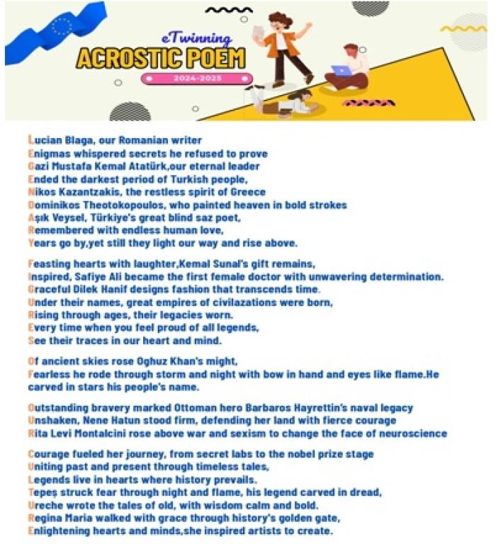Okulumuz İngilizce Öğretmeni Uğur YAĞCI’nın yürüttüğü “LegendaryFigures in OurCulture” (Kültürümüzdeki Efsanevi Figürler) adlı, 11.sınıflardan 7 öğrencimizin yer aldığı etwinning projesi başarıyla sonlandırılmıştır.Okulumuzun partner olarak yer aldığı projede Türkiye’den 9,Romanya’dan 3, İtalya’dan 1 ve Yunanistan’dan 1 öğretmen çalışmalarda yer aldı.Öğrencilerkültürlerindeki efsane kişiler hakkında araştırmalar yapma,yabancı dil becerilerini geliştirme,farklı ülke ve kültürlerden arkadaşlar edinme fırsatı buldular.Web2 araçlarını ve teknolojiyi etkin kullanarak,özgüven ve ekip ruhu çalışmalarını artırdılar.